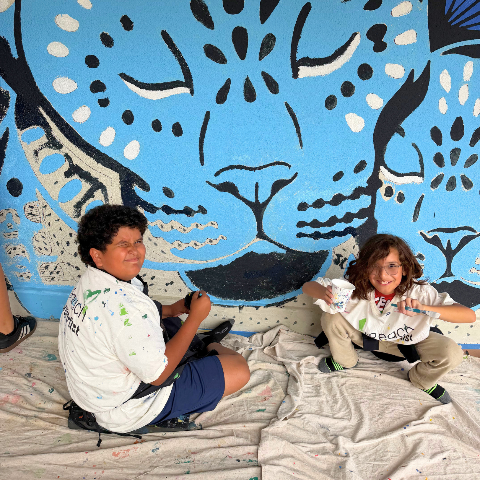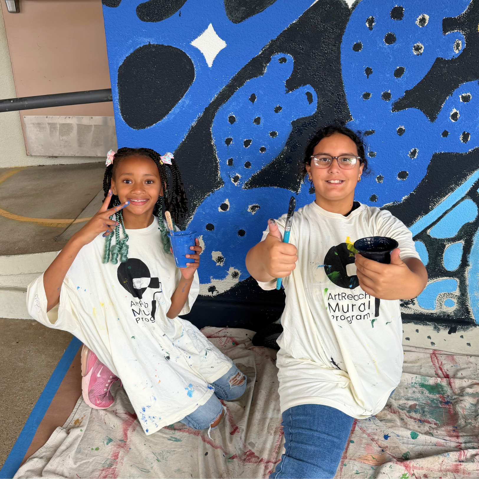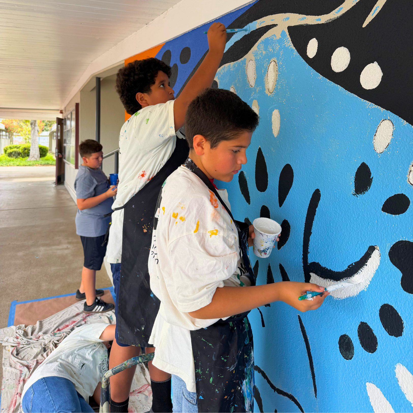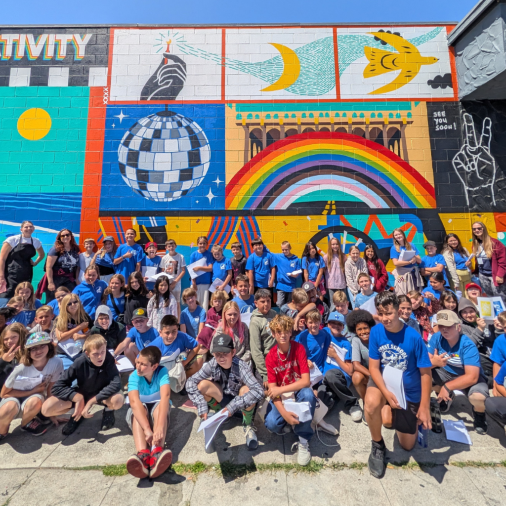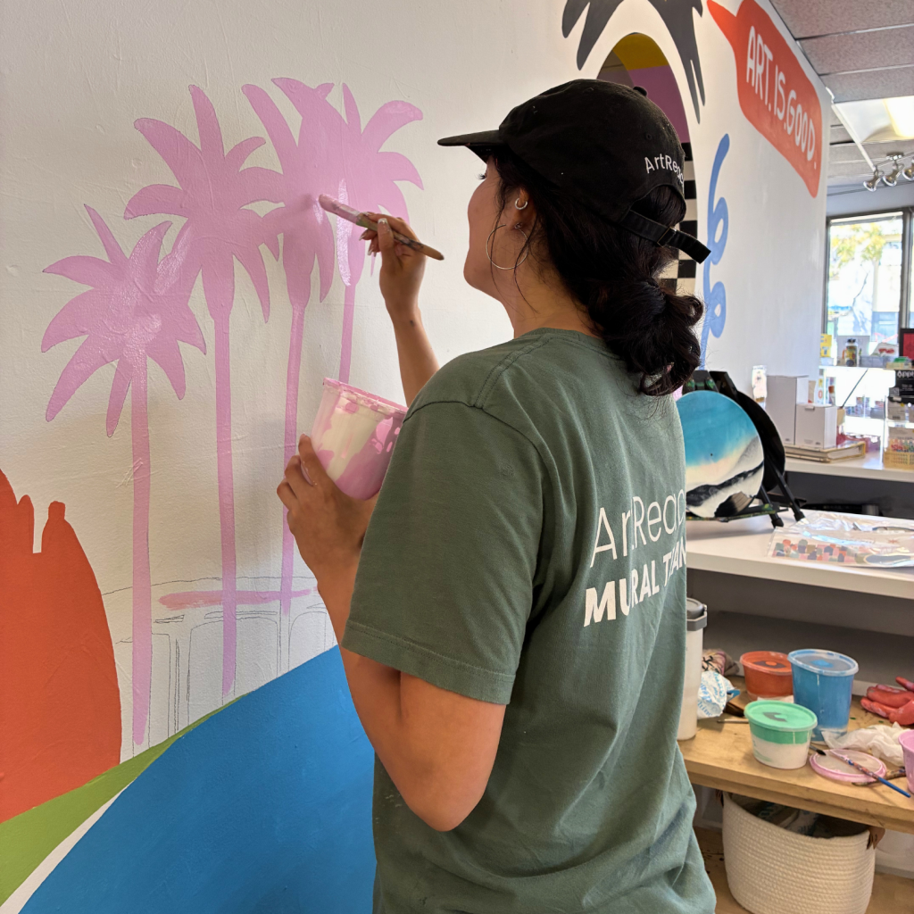 The ArtReach Mural Internship Program is in full swing! Our mural interns, Ale, K, Ezra, and Phoebe, have been helping to bring large-scale murals to life in schools and neighborhoods across San Diego County. Working closely with their mentors, the interns assist with preparing the materials, transferring mural design onto walls, working with students and community members, and painting the murals themselves.