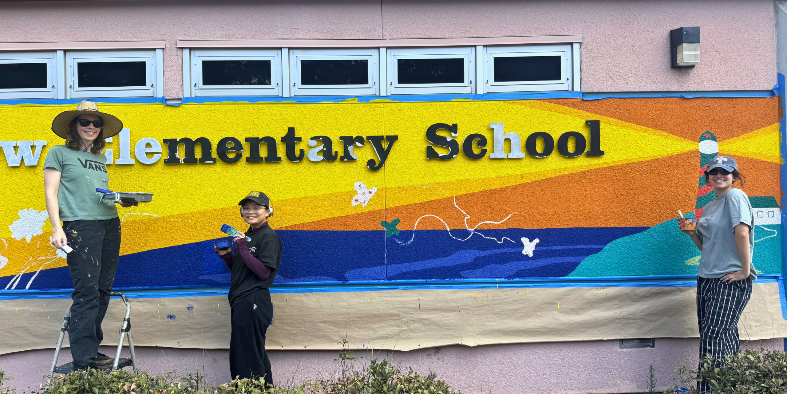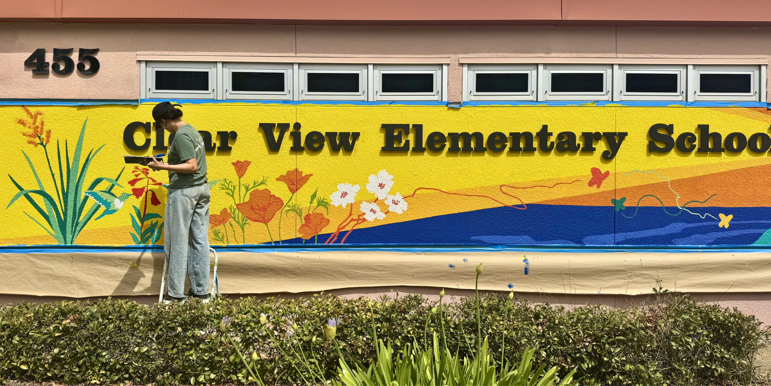 Together, the interns played a key role in completing two recent murals in Chula Vista, supporting both the artistic process and community engagement. The first, at Clear View Elementary School, was designed by ArtReach Mural Artist Partner Lux Meteora and painted with the entire 6th grade. Located at the front of the school, it welcomes visitors while reflecting the Voyager identity through a visual journey of native plants, hummingbirds, and a ship rising into space—symbolizing imagination and possibility.