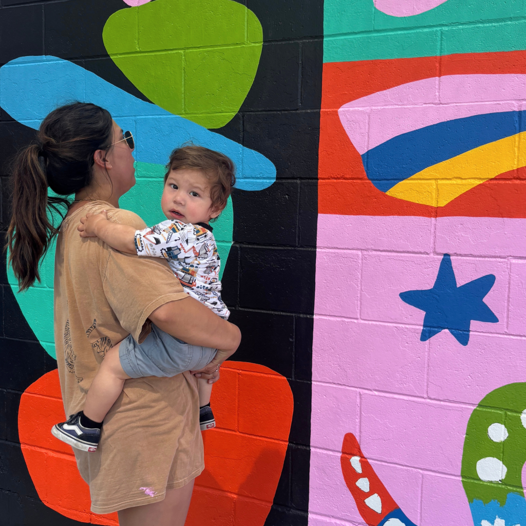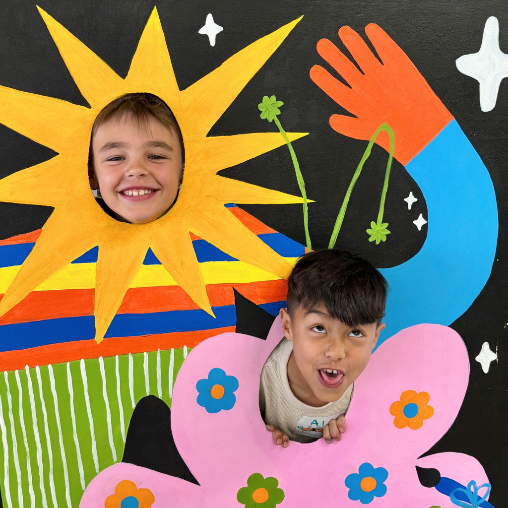 Behind the scenes, our space is transforming too. Our back lot just got a major upgrade, with a vibrant, play-centered mural designed by Studio Programs Manager Laurie Evans. What used to be a blank wall is now a colorful, interactive space made for creativity and connection. Inside, we’ve been adding new touches as well, including a fresh indoor mural designed by Marketing Coordinator Becca Dwyer and painted by our Mural Interns, Ale, K, and Ezra.
