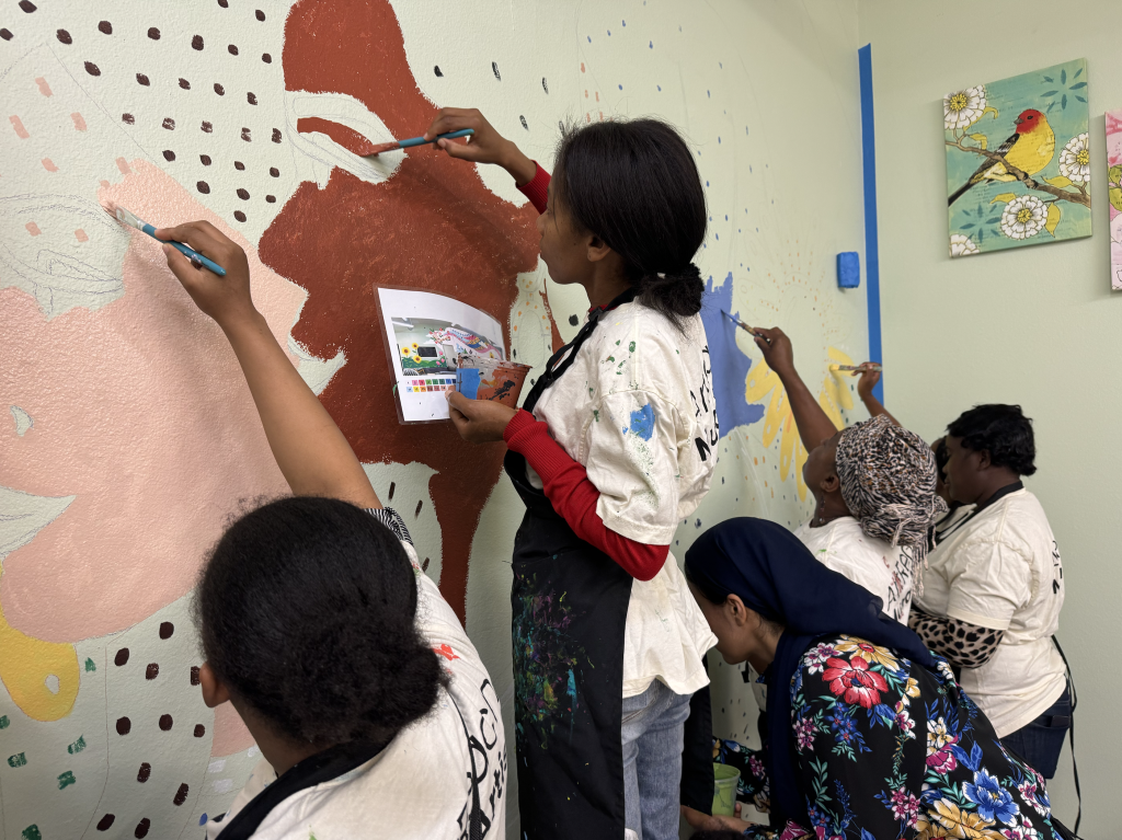 Every mural takes a huge amount of hands-on effort to pull off, from hauling paint and ladders around the city, to setting up sites and scaffolding, to guiding dozens of participants through the painting process. Our mural team does it all: long days on their feet, painting under the sun, and staying focused on the details that bring each wall to life. On top of that, they lead with care, designing murals that reflect the voices of those we work with, and creating spaces where people feel proud to contribute.