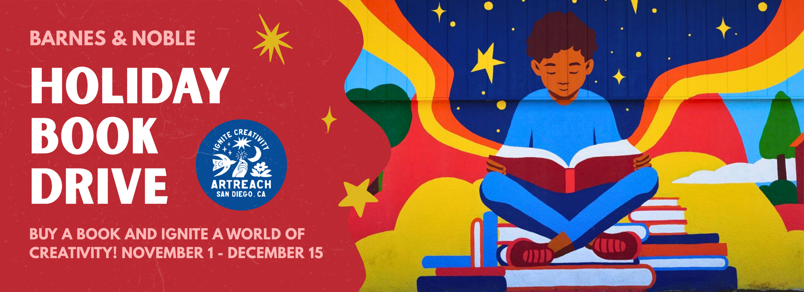 From November 1 through December 15, 2025, you can help ignite creativity in San Diego youth by donating a book during the Barnes & Noble Holiday Book Drive at Barnes & Noble Hazard Center. Every book you give supports ArtReach San Diego, helping bring the power of art and storytelling to young artists across our community!
