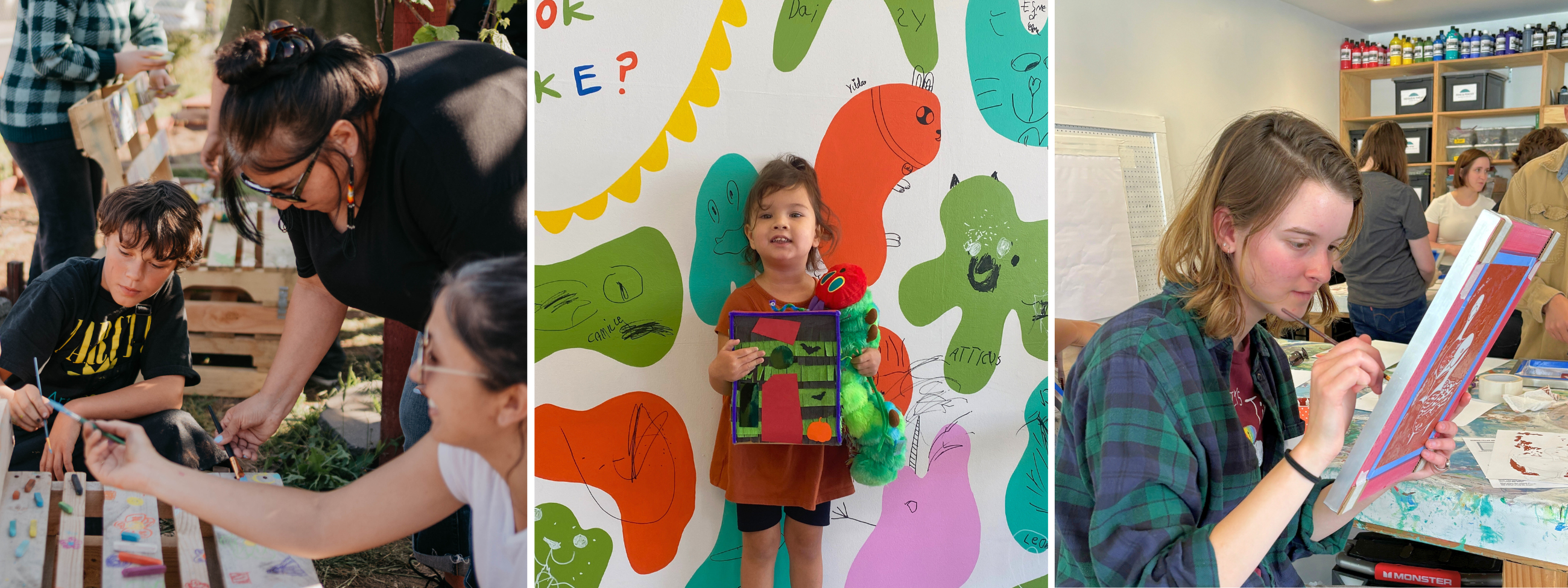 We offer a range of free and low-cost art workshops for kids, teens, and families of all skill levels, providing a nurturing and welcoming creative space that encourages self-expression. Through working closely with professional artists during after-school classes, drop-in play, or family workshops, young artists strengthen fine motor skills, critical thinking, and collaboration, while working towards a final product that reflects their growth and artistic voice.