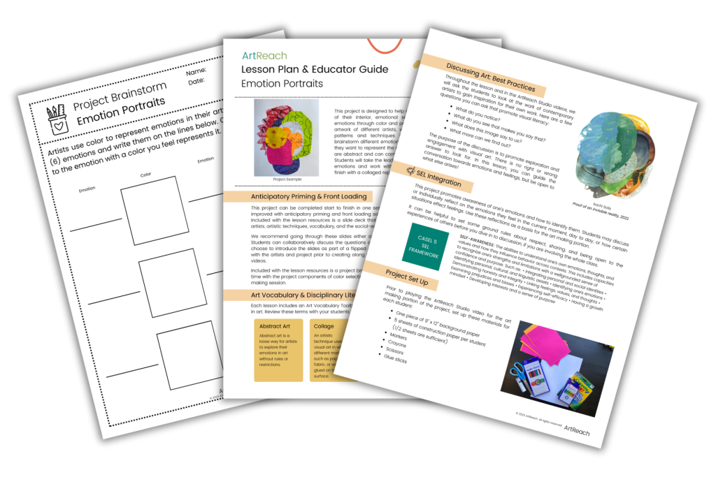 Each lesson is accompanied by educator and student resources. A detailed educator guide covers the lesson, social-emotional connections, and gives teachers guidance on how to talk about art and expand the project with different age groups. Student resources are provided in English and Spanish to assist students in conceptualizing, planning, and creating their artwork.