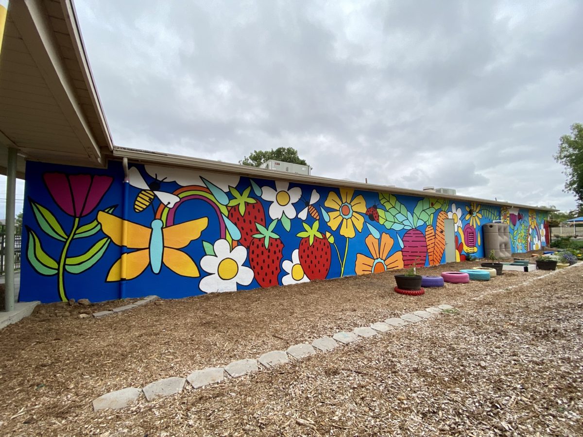 This bright, bold, and colorful garden mural celebrates growth, transformation, healthy eating, and nature! Hanna Gundrum led the 8th grade students to work together to come up with much of the imagery seen here: bright daisies, strawberries with bites taken out of them, a camouflaged gecko, and more. The 8th grade mural artists spent 4 paint sessions painting the majority of this long stretch of wall with focus, creativity, enthusiasm, and care. This mural is a reminder of the benefits of teamwork: it could not have happened without everyone working together in collaboration. This work serves as a legacy piece for the 8th graders: a contribution and gift to PRIDE before they leave for high school. As the seasons change, new seeds will be planted, and new growth will occur. This big new mural will continue to help cultivate this garden space as one for reflection, gathering, and tending the earth.